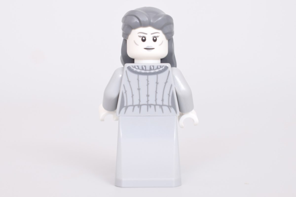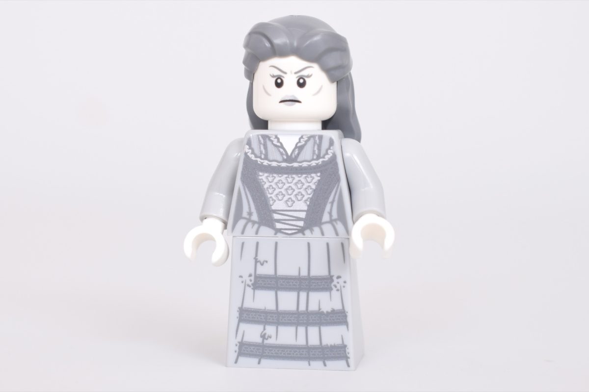 Selv for at være et spøgelse ser hun en smule slidt ud, hvilket stemmer overens med den prøvelse, hun har haft selv i efterlivet. Der er kun tryk på forsiden af nederdelsdelen, men detaljerne på hendes ansigtstryk gør det til en samlet imponerende minifigur. Du finder hende i 76463 Hogwarts Slot: Hospitalfløjen.
