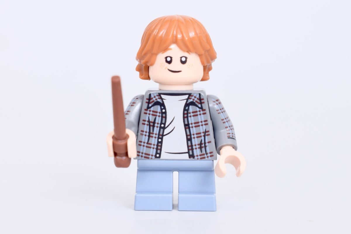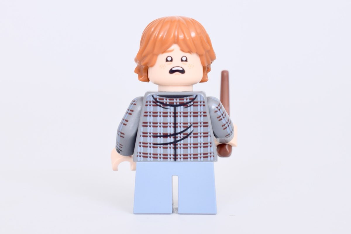 Ron Weasley ligner sin minifigur fra 76454 Hogwarts Slot: Hovedtårnet, men denne gang er der armtryk for første gang med denne torso. Det ternede tryk på hans skjorte fortsætter hele vejen ned ad armene i versionen af ham i 76466 De vises sten – samlerudgave.