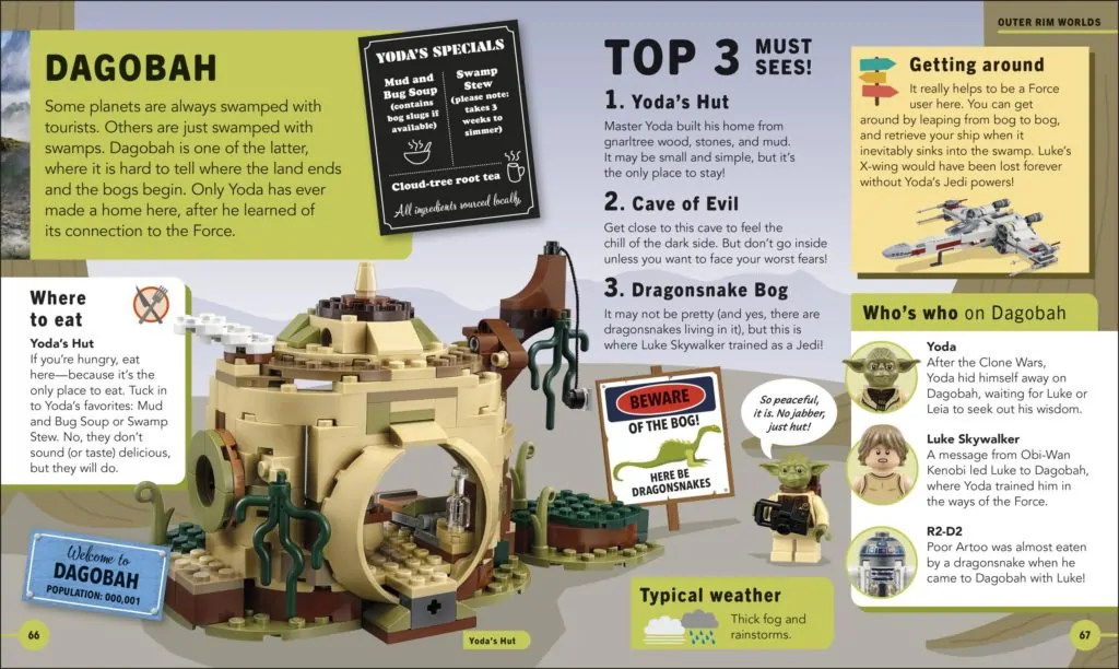 Yodas Galaxy Atlas ser den grammatisk udfordrede Jedi Master tage en visuel rundvisning på 25 forskellige planeter fra Star Wars univers - fra Hoth og Crait til Dagobah og Tatooine - på tværs af 96 sider. Det hele er lidt 'hvis Star Wars gjorde Trip Advisor 'med sightseeingtips, vejrrapporter, karakterguider og endda anmeldelser.