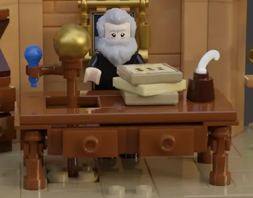 I midten af bygningen har skrivebordet bibeholdt den roterende orrery-funktion, selvom dets design er meget enklere, end det oprindeligt blev foreslået. Genstande er også blevet flyttet rundt, herunder at flytte orreryet ind på midten og forkorte stakken af papirer.
