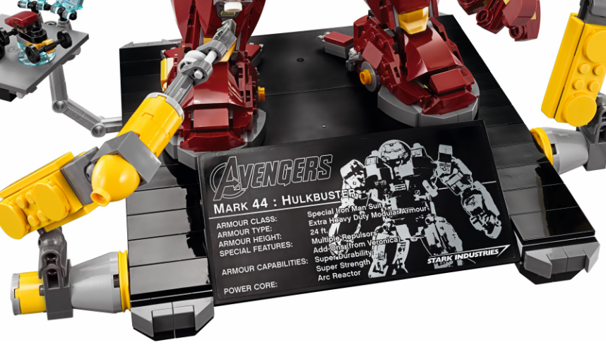 Mens begge LEGO Marvel Hulkbusters inkluderer en informativ plakette med fiktive detaljer om rustningen, 76105 The Hulkbuster: Ultron Edition inkluderer også et komplet stativ til at stille rustningen på. Ingen sådan stand er vist i Hulkbuster 76210, selvom det er meget større end 2018-modellen, så det stativ ville have skullet skaleres op i overensstemmelse hermed.