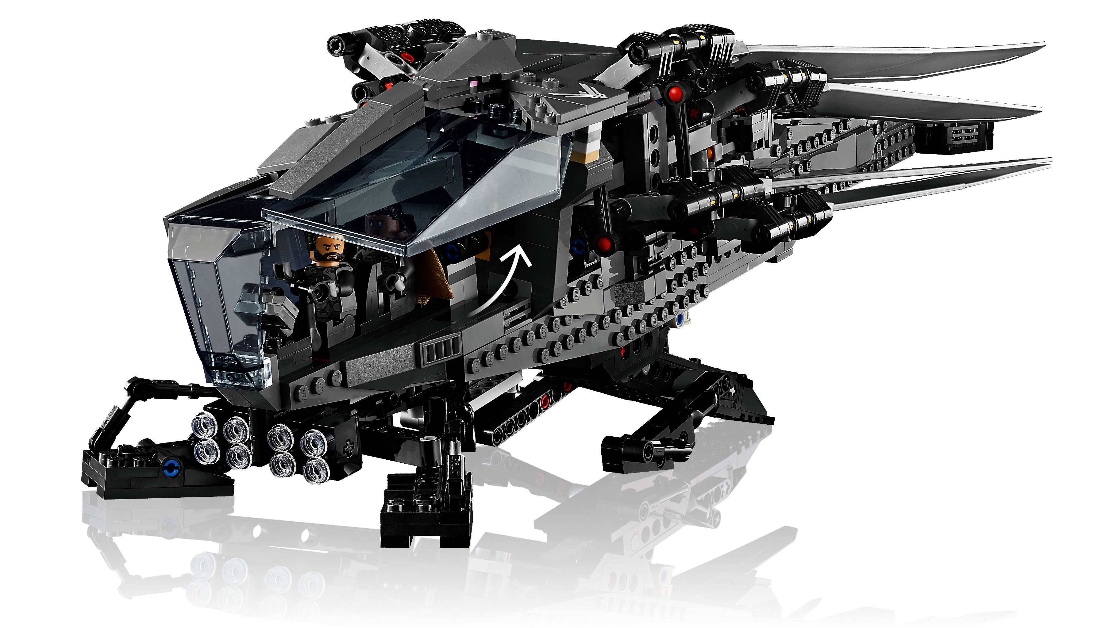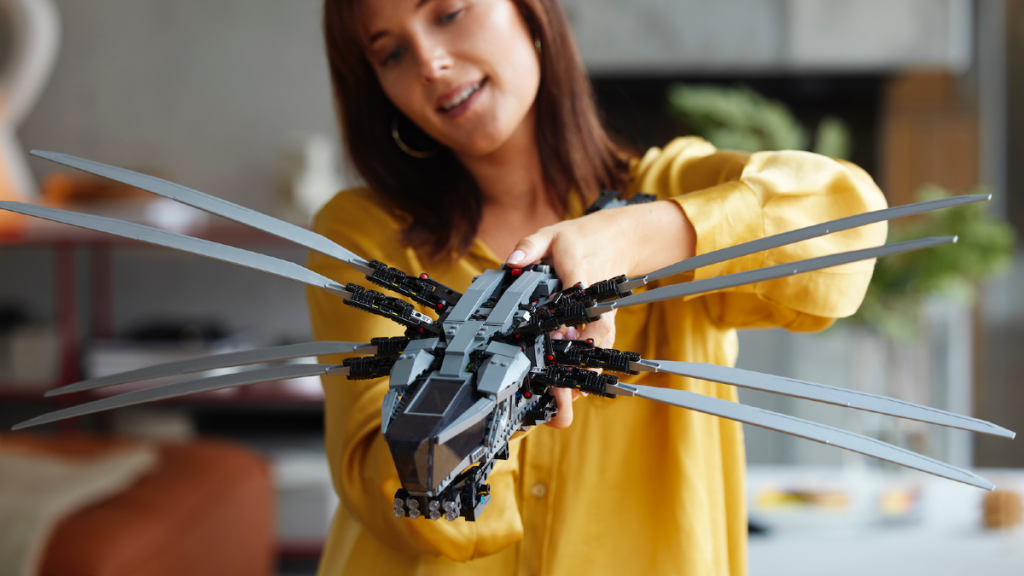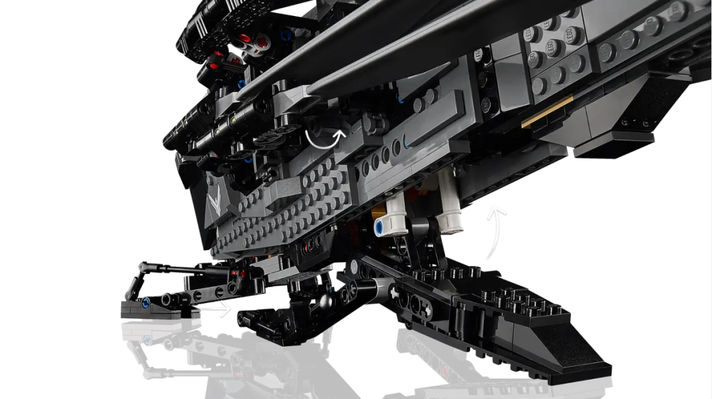 Ligeledes er der også inkluderet en sænkende bageste adgangsrampe, sammen med fire deployerbare landingsstel, der afspejler filmfartøjets egen funktionalitet, dog i mindre skala end versionerne på skærmen. Det er dog de udfoldelige og flaksende vinger 10327 Dune Atreides Royal Ornithopter som let er det iøjnefaldende træk ved det kommende LEGO Ikoner sat.