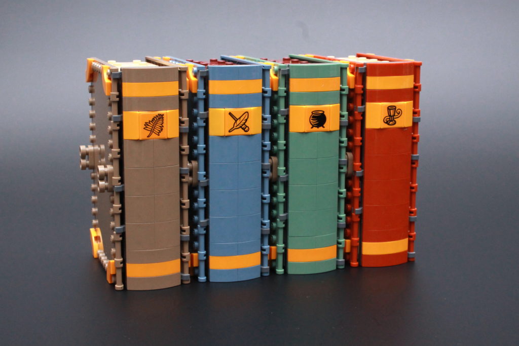 Spørgsmålet er nu: hvordan hænger de sammen? Hvis du har bygget en af bøgerne, eller bare kigget vores anmeldelser igennem, vil du helt sikkert have bemærket de 1×2 afrundede plader, der er fastgjort til hver bagside. Og de er der af en grund: at tillade alle fire bøger at forbinde og vise side om side eller spredt ud i et 360-graders diorama.