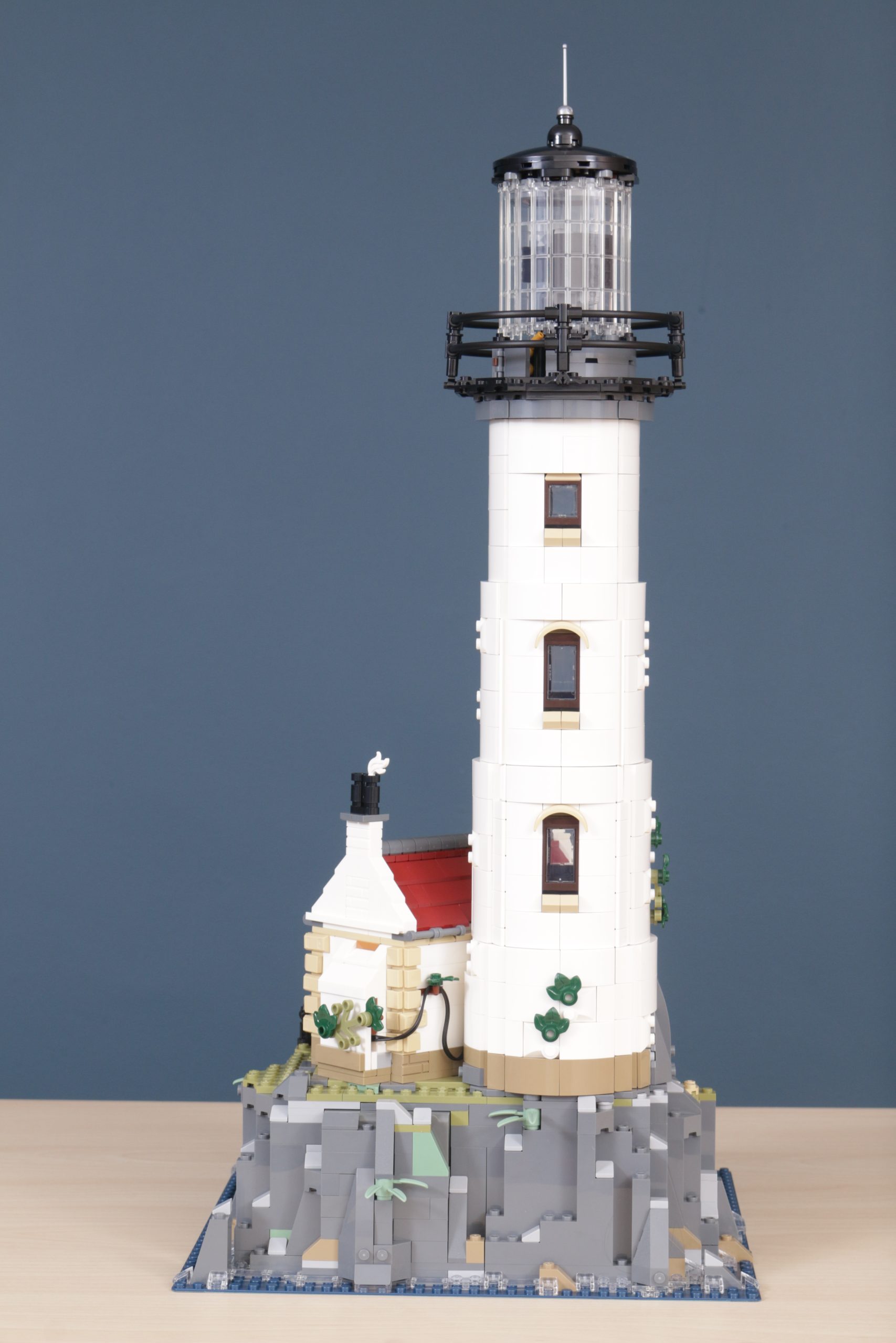 Inde i fyrtårnet og hytten ved dets base er der et opholdsrum til den medfølgende minifigur med en let mursten til en hyggelig ildeffekt.