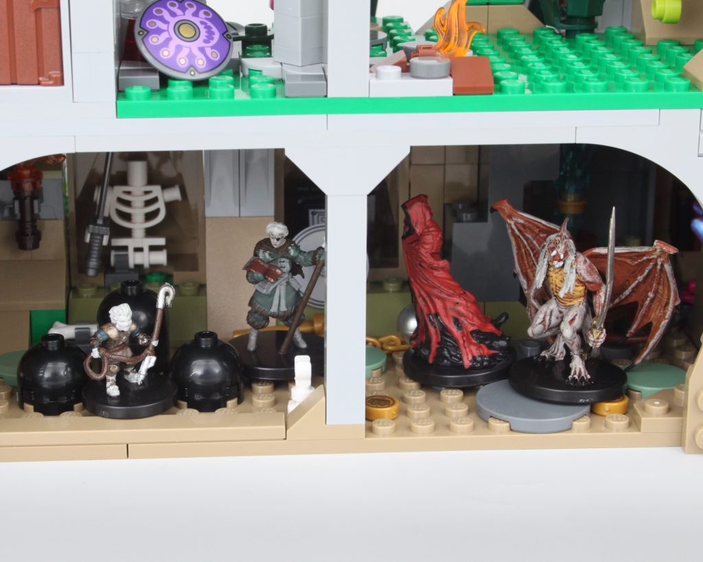 På trods af den mængde plads, der er til rådighed, fungerer størrelsen af miniaturer sammenlignet med minifigurer til deres fordel i fangehullerne i 21348 Dungeons & Dragons: Red Dragon's Tale da der er meget mere plads til dem, og de er generelt nemmere at nå og flytte rundt på takket være den medfølgende base.