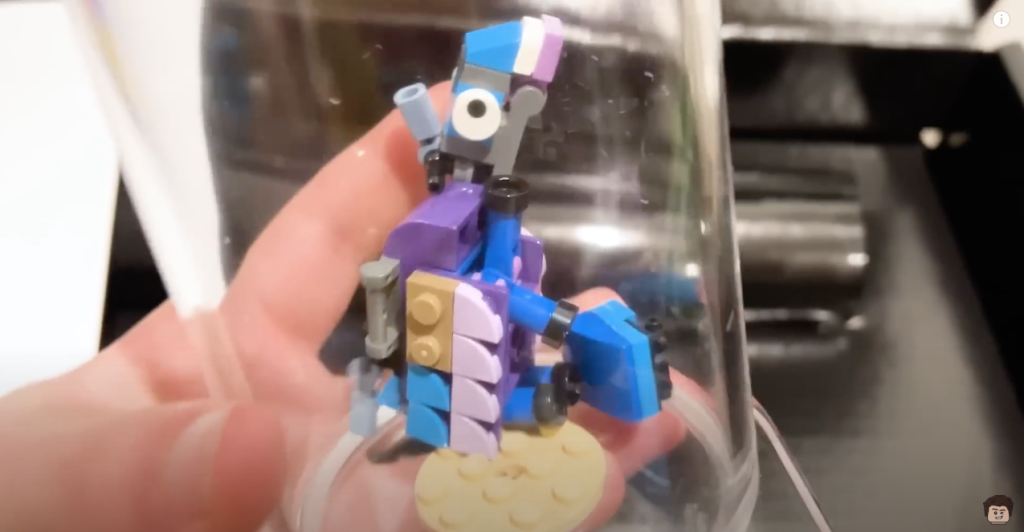 Også inkluderet i LEGO Fortnite mysterieæsken er en klodsbygget Loot Llama forseglet i akryl, samme model som var tilgængelig hos en række nylige personlige begivenheder og en, der kan konstrueres vha disse officielle instruktioner. Desværre ser det ud til, at den version, Ashnflash modtog, blev beskadiget under transporten, hvor videoen afslører en bunke løse stykker, der rasler rundt inde i røret i al evighed.