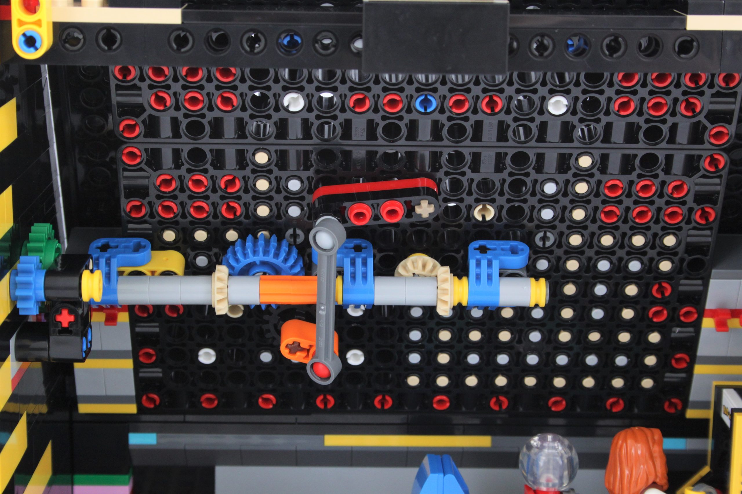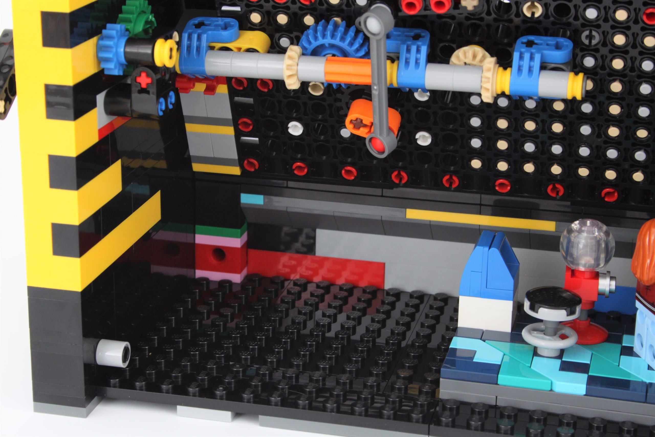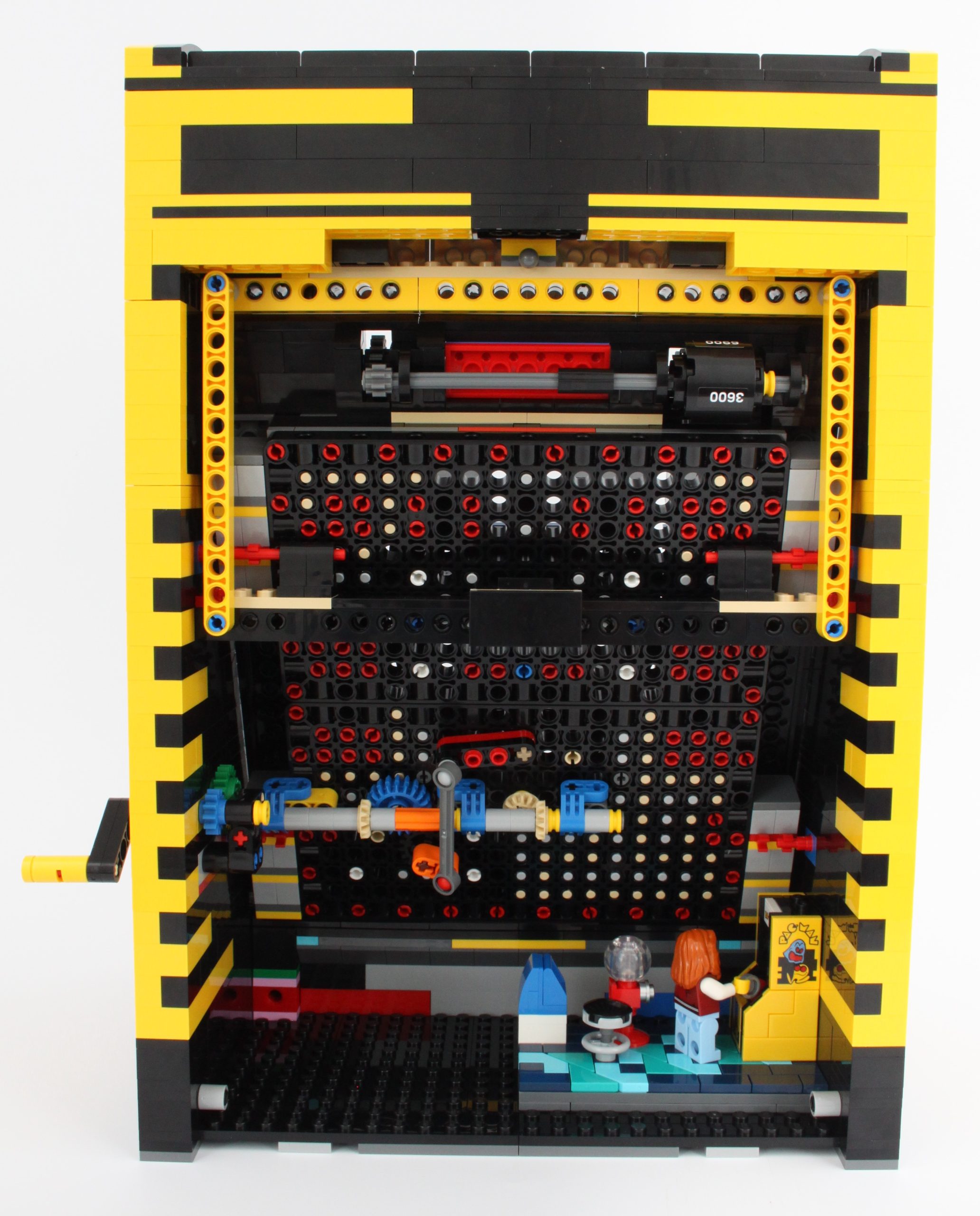 Spændingen fortsætter inde i kabinettet, hvor mekanismerne kan ses tydeligere. De kan virke enkle, men de er alt andet end at sætte sammen. En lille del af denne plads bruges som opbevaring for et diorama af en mini-arcade, komplet med en lille PAC-MAN-maskine.