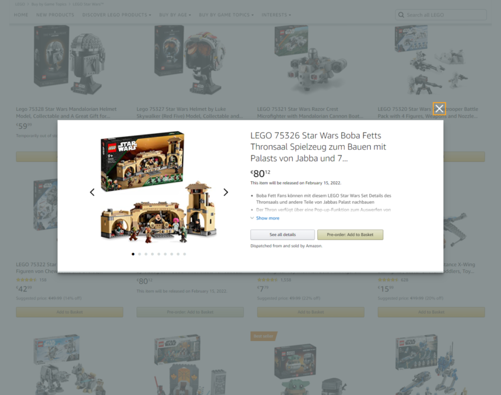 LEGO Star Wars Amazon Tysklands hjemmeside har tilføjet en forhåndsvisning for 75326 Boba Fett's Throne Room, hvilket bekræfter tidligere rygter sæt. Hovedfortegnelsen for modellen er ikke live på online butiksfronten, selvom forhåndsvisningen tilbyder et udvalg af billeder i lav kvalitet, herunder et, der giver os et nærmere kig på minifigurerne.