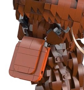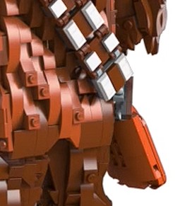 Blandt livsstilsbillederne af den bygbare Wookiee - det vil sige dem, der er skudt in-situ, snarere end produktgengivelser - er et nærbillede af hans taske og bandolier. Og de Mixel-stil kugleledselementer, der bruges til at fastgøre bunden af bandolieren, er tydeligt mørkebrune, hvilket markerer første gang, at disse tidligere farvelåste stykker ville have været tilgængelige ud over nuancer af grå. Glade dage! Hvis bare det var sandt.