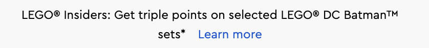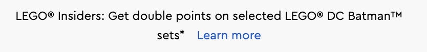 I en rullemenu i toppen af den australske butik er der også opslag, der både fordobles og tredobles LEGO Insider-point kan optjenes på udvalgte LEGO Batman sæt. Selvom disse links ikke virker endnu, tyder det på, at kampagnerne endnu ikke er live eller ikke er tilgængelige i Storbritannien (hvor Brick Fanatics er baseret), så vi kan ikke sige, hvilke LEGO-sæt der vil være inkluderet i de dobbelte og tredobbelte point tilbud.