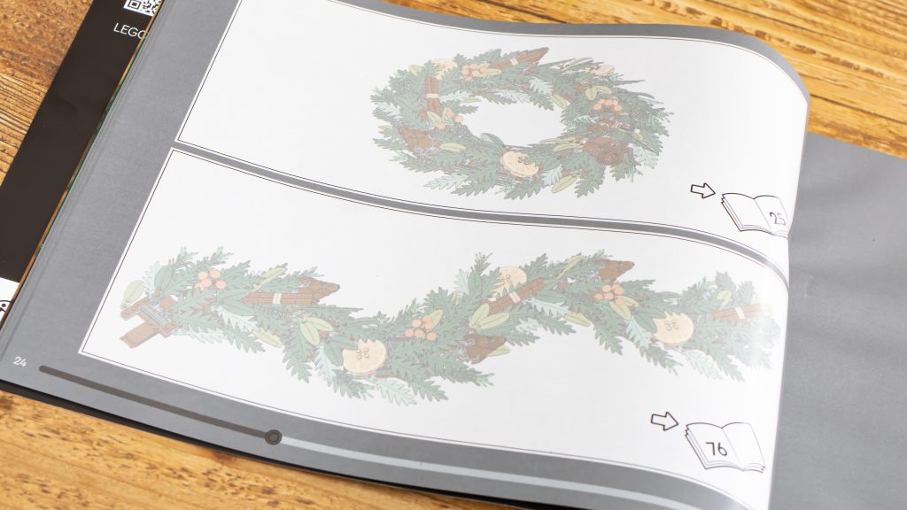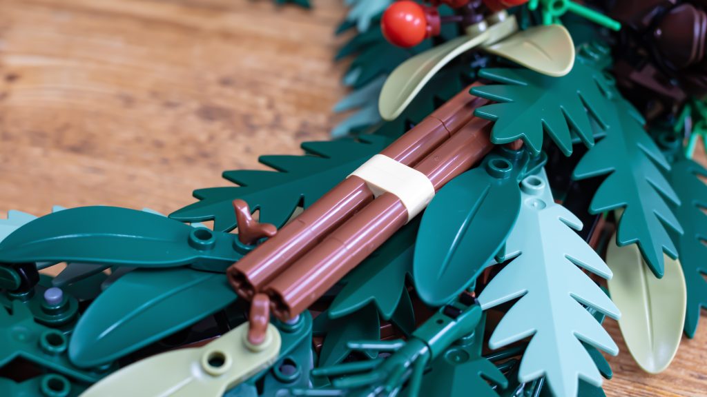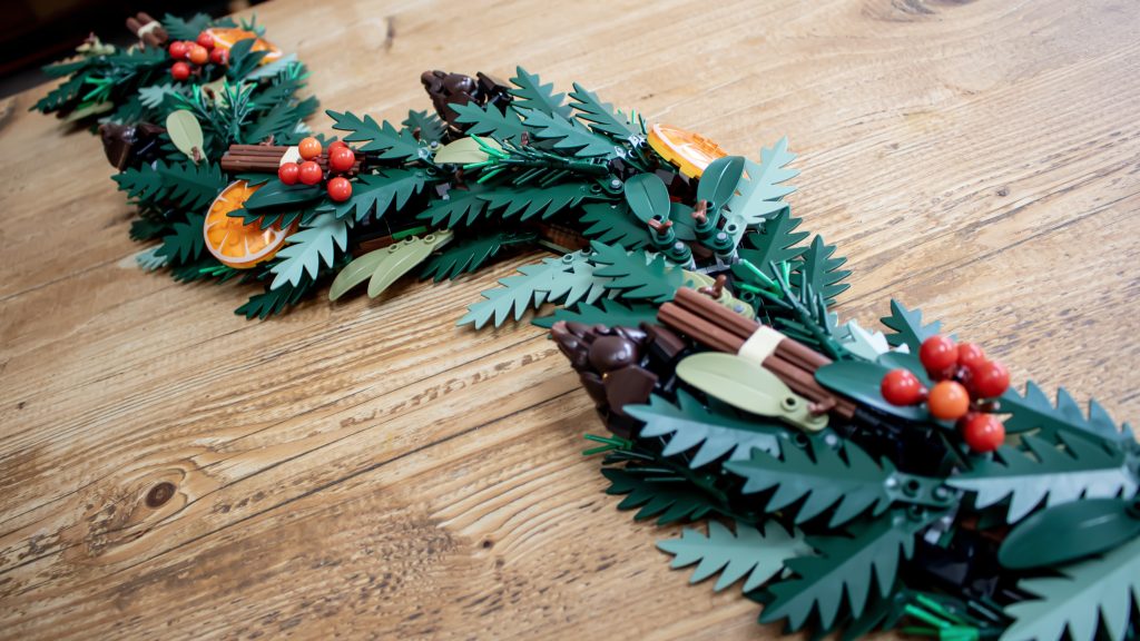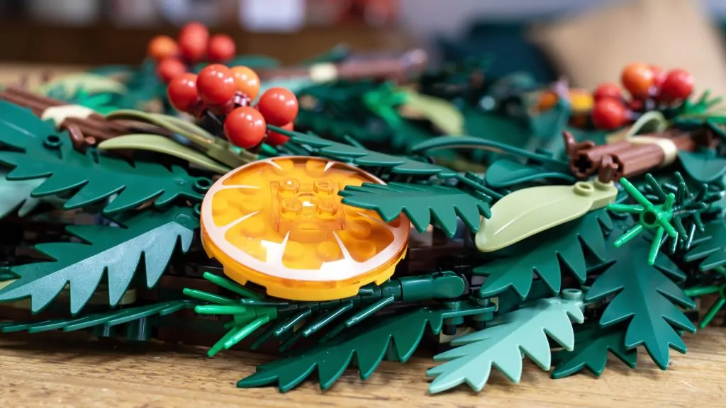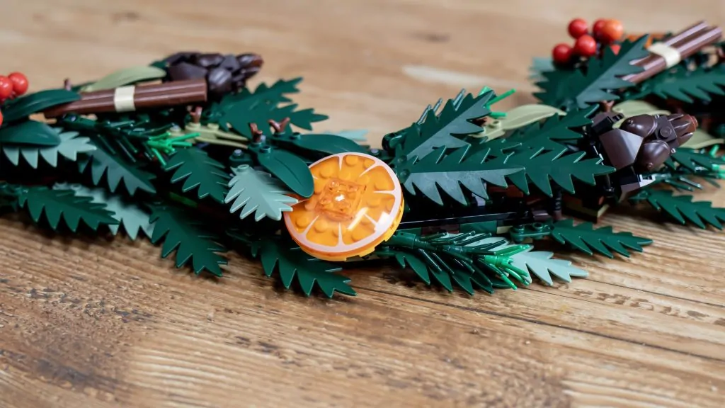 De dekorative detaljer giver virkelig kransen liv. De trykte appelsinskiver (lavet af gennemsigtige appelsinskåle) og fyrrekogler er særligt bemærkelsesværdige. Fyrrekoglerne er et eksempel på LEGO Group's designkreativitet, når det er bedst - hvem vidste, at flade minifigurer kunne fungere som grankoglestykker? Disse små, men smarte detaljer får bygningen til at føles unik og givende, og hjælper modellen med at stå med hoved og skuldre over det, der er kommet før. Små bundter af bær fuldender looket, og sættet kommer med bær i rød, hvid og blå, så du kan tilpasse udseendet til din smag.
