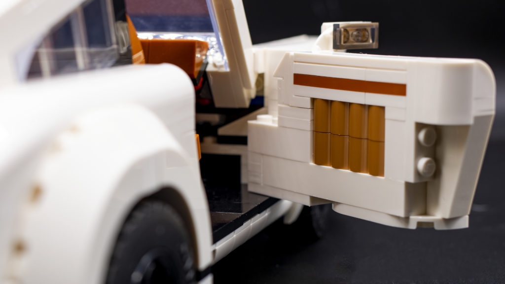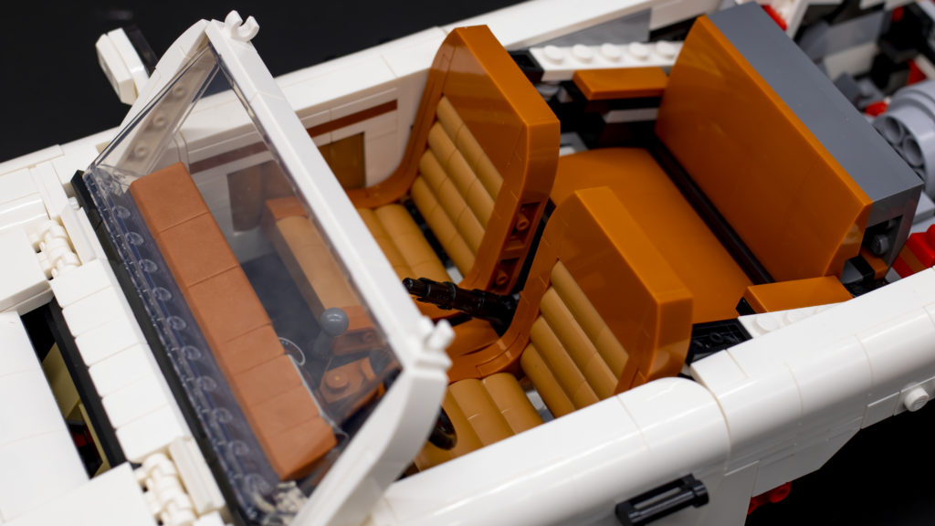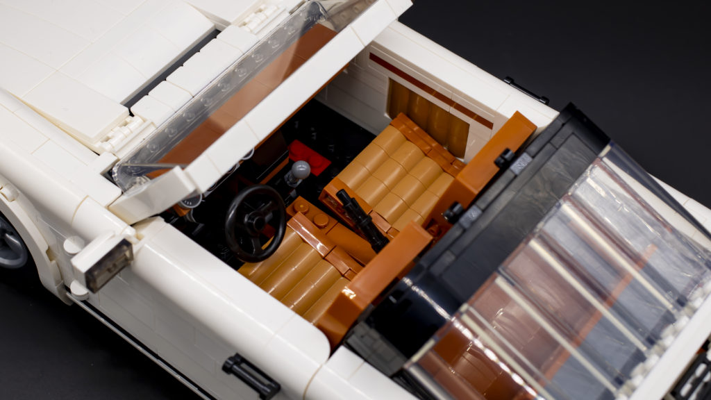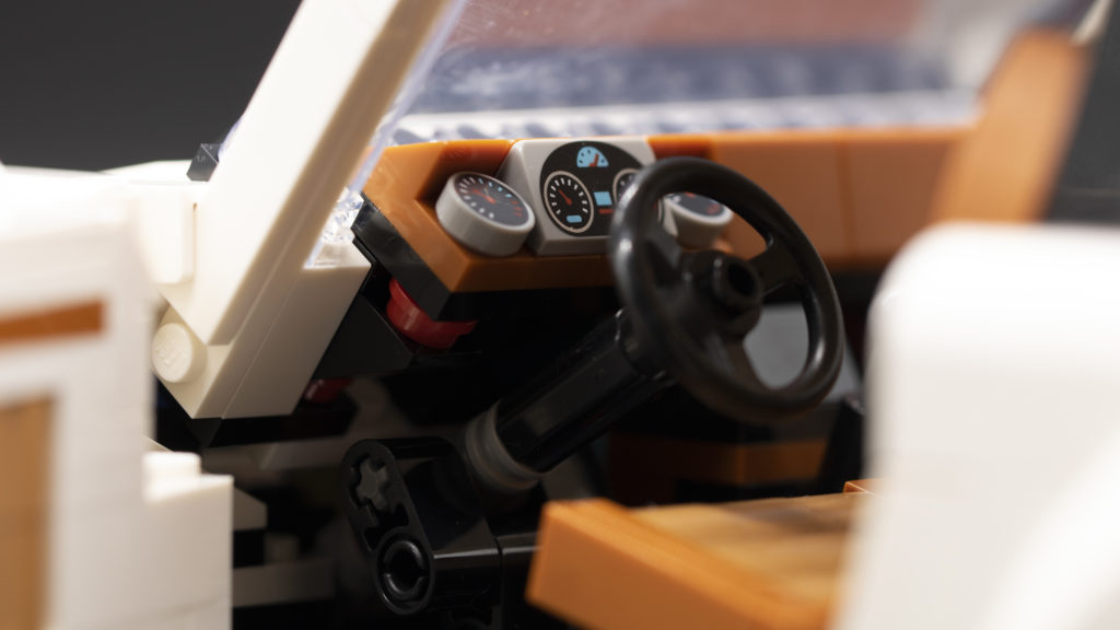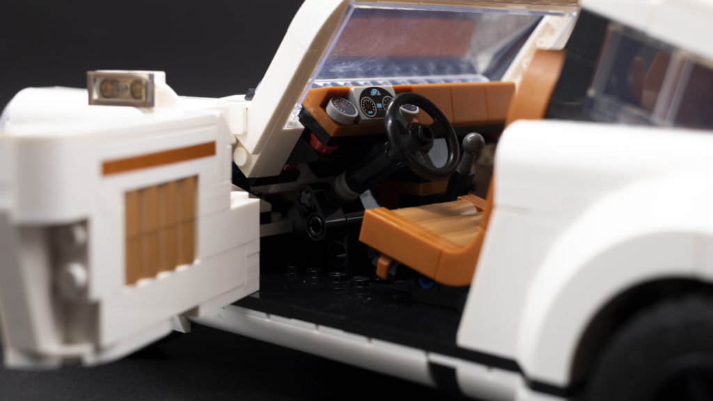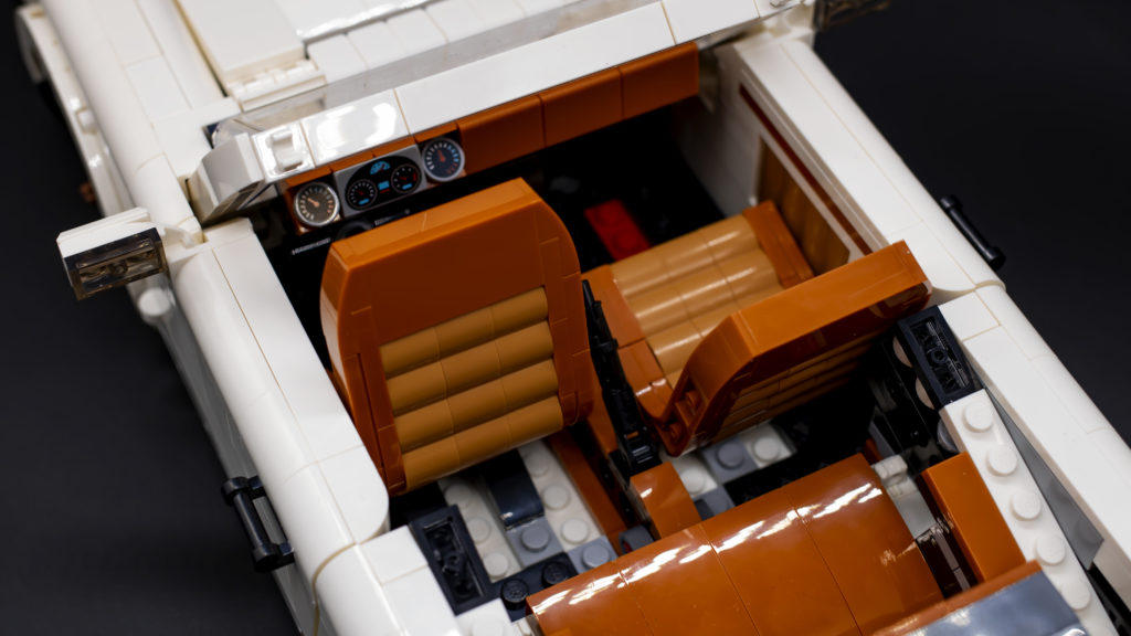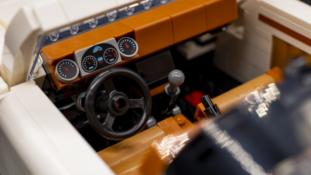 Dette strækker sig til de indvendige sektioner. Forsæderne bruger 3 × 3 hjørneplader til at skabe en smukt buet form. Hvert sæde er konstrueret separat og fastgjort til en hængselcylinder, der giver dem mulighed for at svinge fremad som i det rigtige køretøj. Det er en unødvendig funktion, men meget velkommen, for ikke at nævne et meget kreativt og behageligt design. En lille håndbremse og en gearstang, der fungerer, tilføjer nogle fantastiske og nøjagtige detaljer - det er et bevis på kreativiteten i dette sæt, når selv den enkleste ting som design af en gearstang kan bringe et massivt smil i dit ansigt.