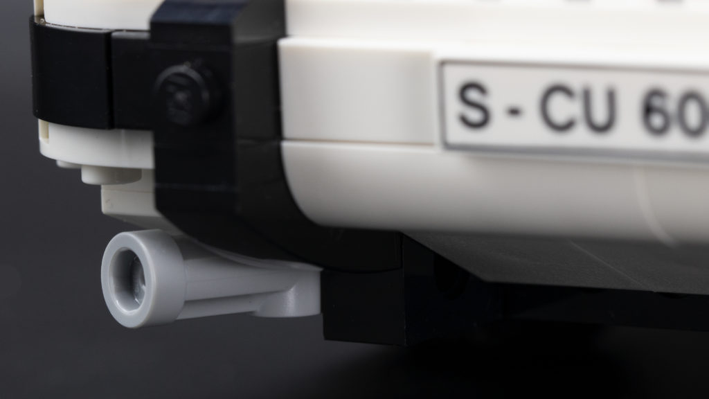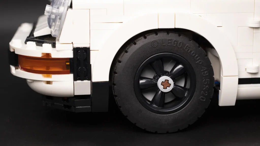 En 1 × 2 plade med stifthul ovenpå bruges kreativt, når man bygger toppen af hjulbuerne. En lille underenhed klemmer to af dem på hver side af store plader med 1 × 2 plader med klemmer fastgjort. Dette giver mulighed for en lille bevægelse inden i underenheden, hvilket skaber en meget let neddypning. Det er genialt, da den samme lille vinkel ikke ville være mulig med en standardforbindelse. På næsten hvert trin er der disse vidunderlige små lommer med designperfektion.