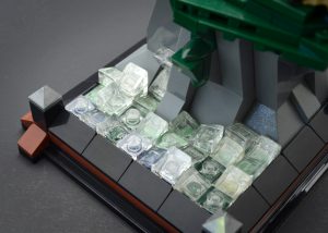 Dette er åbenbart en meget mindre bygning end resten. Selv med et 8 × 8 byggeområde er der meget, du kan gøre for at give din vignet liv. Med et så lille fodaftryk kan det være klogt at bruge lodret plads til at give din bygningsdybde og vægt. I dette tilfælde har jeg opbygget klippen, så den strækker sig over basen. Dette hjælper bygningen med at føle sig levende. Bare fordi din base er firkantet, betyder det ikke, at din build skal være. Et andet praktisk tip til dem, der ønsker at skabe vand ved hjælp af gennemsigtige mursten i deres opbygning, er at lægge et fundament i forskellige farver. Er vandet i din scene et lavvandet flodleje? Prøv en mørk brunfarve med noget mørkegråt smidt ind. Et dybt hav? Brug noget mørkeblåt fading til regelmæssig eller endda mellemblå afhængigt af variationen i dybden. Dette kan tilføje en subtil dimension til din build. Du kan endda gå så langt ved at bruge flere lag med forskellige klare mursten. Vær ikke bange for at prøve forskellige kombinationer for at få det rigtige udseende til din build.