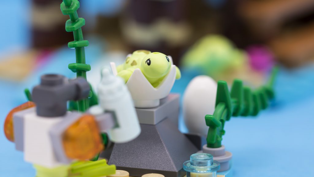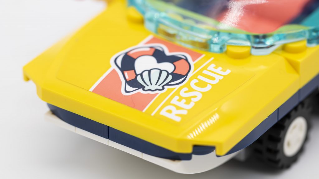 LEGO Friends køretøjer har en tendens til at blive lidt ramt. Heldigvis her er Olivias amfibiebil en sjov lille bygning. Der er tilføjet fine detaljer i formen af kontrolpinden, trykte skiver og propel fastgjort på bagsiden. Omvendte 1×4 buede skråninger bruges foran og bagpå for at skabe enkel, men effektiv formgivning. Farveskemaet med hvid, mørkeblå og gul fungerer også rigtig fint sammen og hænger sammen med Olivias Friends farveskema som ses i andre sæt. Der er plads på bagsiden til både de uklækkede og udklækkede æg, der kan byttes ud til babyskildpadder alt efter præference.