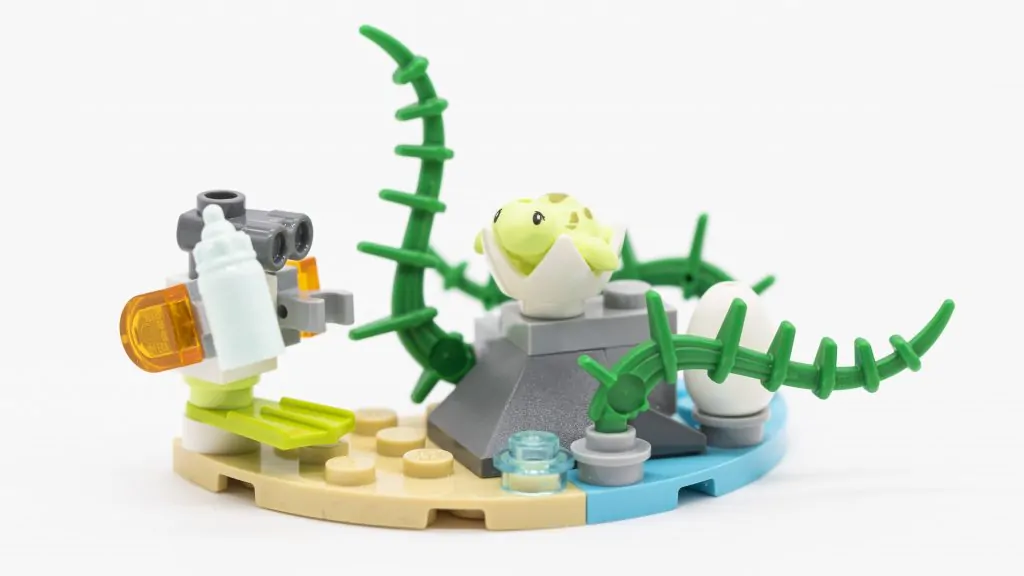 Sættet er delt op i to poser, den første koncentrerer sig om en lille ø, som Zobo (Olivias robotven) sidder på og hjælper med at fodre skildpaddeungerne. Designet til Zobo er virkelig sjovt, at tilføje en limegrøn flipper under kroppen og hvad der ligner oppustelige armbånd på hans arme (to trans-orange 1×1 halve fliser) Zobos hovedstykke er den ret nye runde 1×1 plade med kikkert, i øjeblikket kun tilgængelig i LEGO Friends tema.