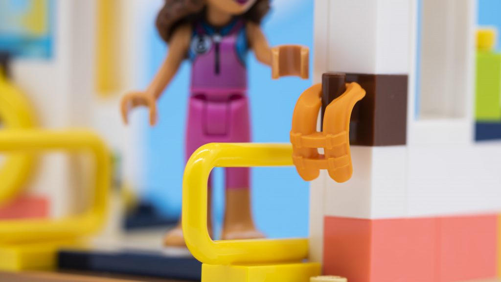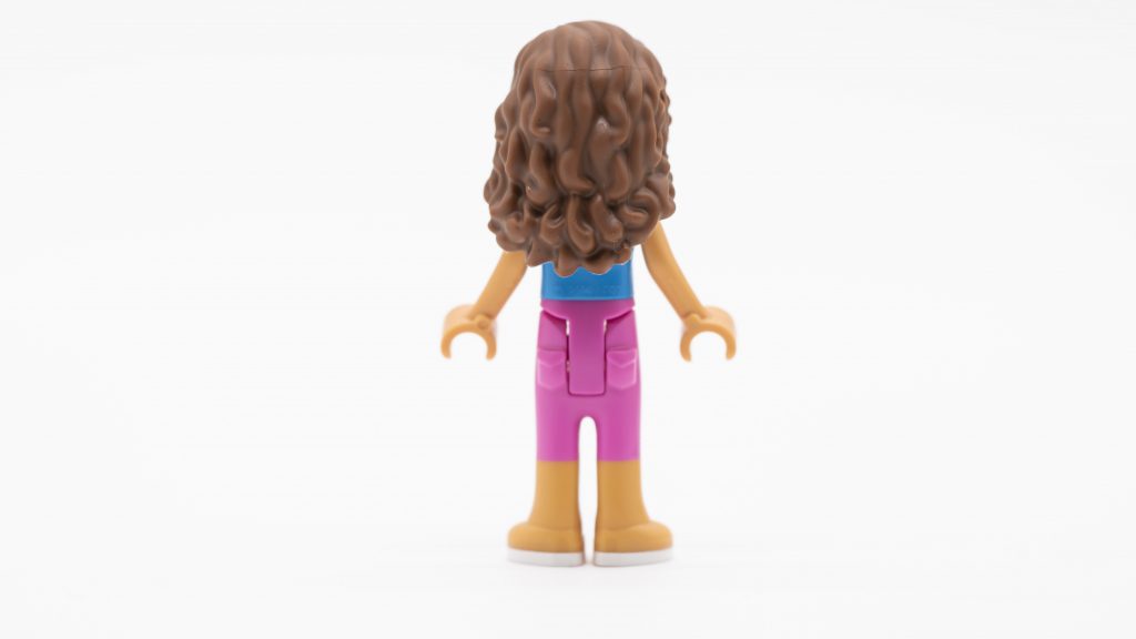 Olivia kommer i en eksklusiv mørk pink våddragt. Selvom det giver mening for hende at være klædt på denne måde til sættet, er printet og det overordnede udseende ikke helt så godt som andre nyere Friends sæt. Virkelig, det er en lille negativ i betragtning af alt det geniale tilbehør og dyr, der er inkluderet.