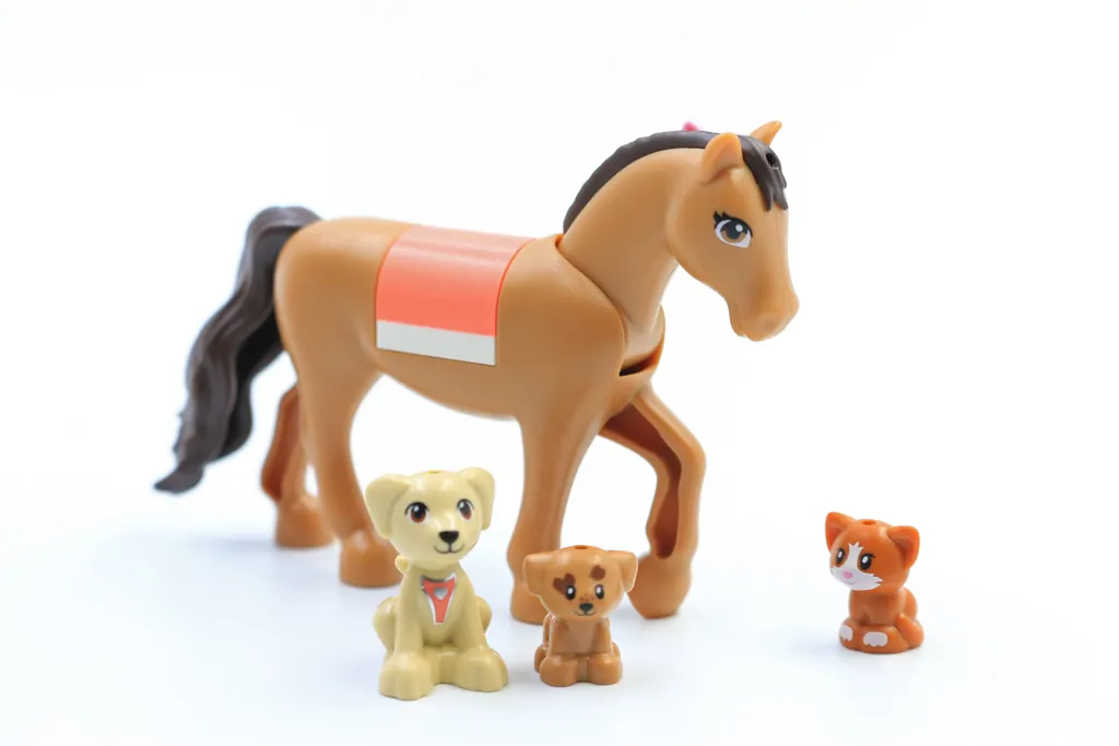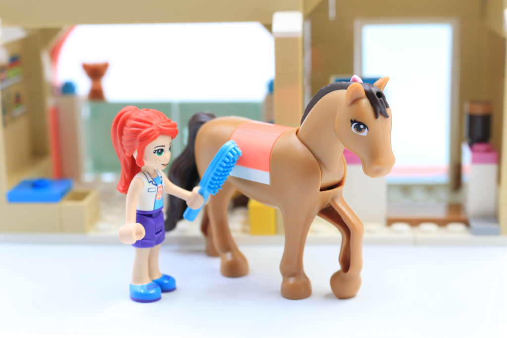 Der er nogle relevante detaljer i stalden, herunder teksturerede gule 1×2 mursten til hø, sammen med en vandhane fastgjort til væggen. Den nye LEGO-hest kan passe indenfor, selvom det er lidt af et klem. Denne nye form virker næsten som om Belville møder Friends, og det er mere realistisk med en poserbar hals og struktureret manke.