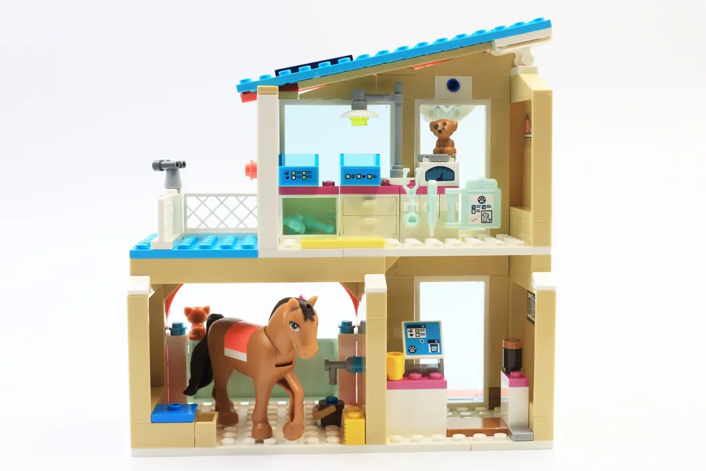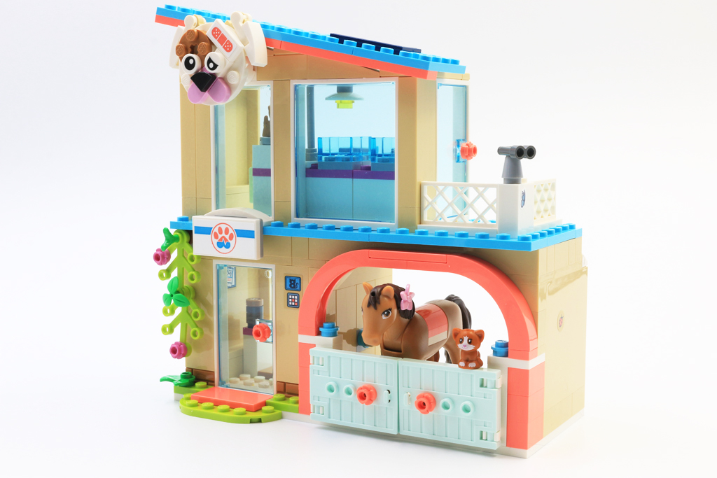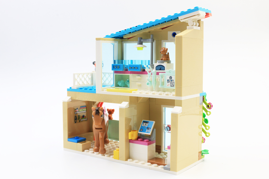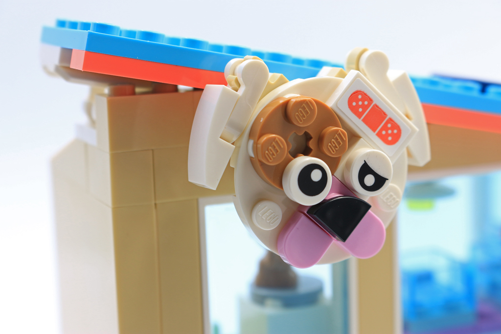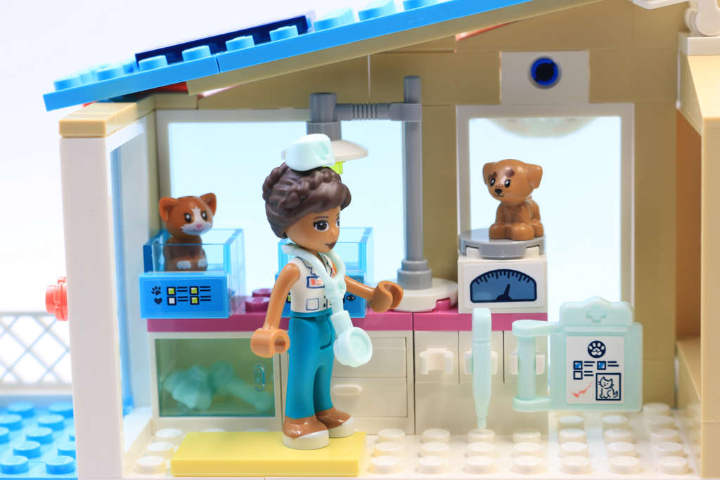 Næsten alle typer LEGO medicinsk tilbehør kan findes i de forskellige skuffer i undersøgelsesrummet, mens der endda er en lille reception i stueetagen. Alligevel virker disse detaljer næsten halvhjertede, blegne i sammenligning med andre Friends sæt af samme type med alt for meget afhængighed af klistermærker. Næsten flere stykker går ind i det søde hundeskilt på taget end i det meste af interiøret.