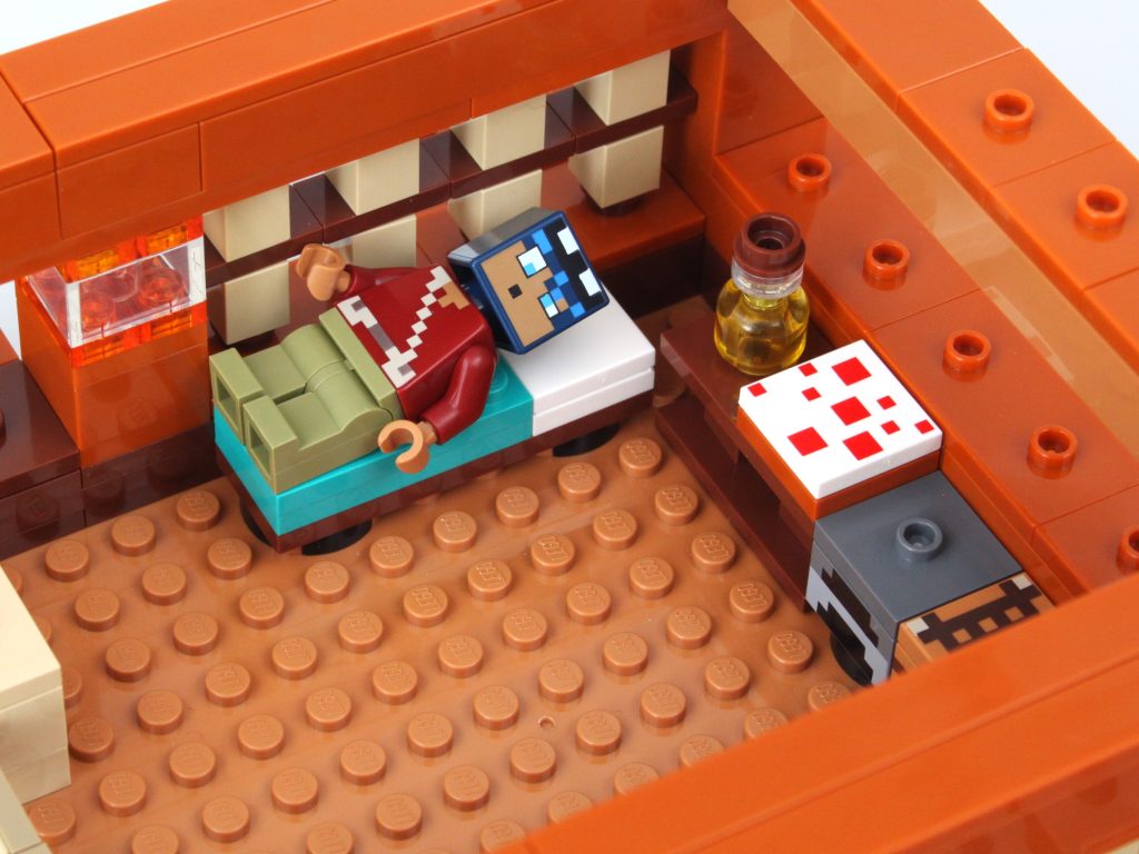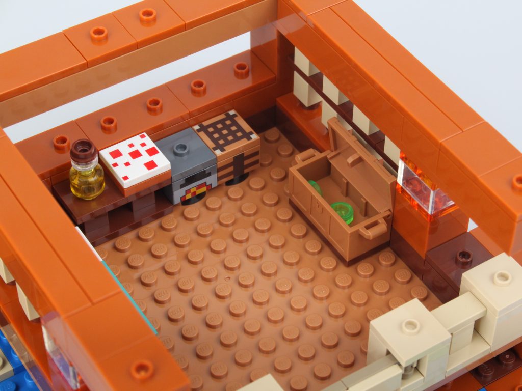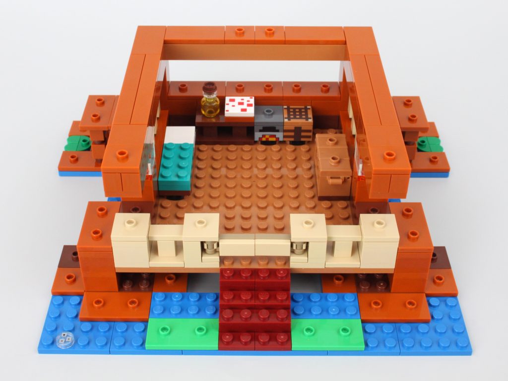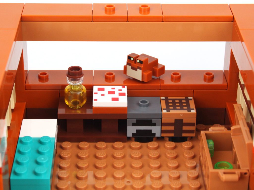 Selvom der ikke er en overflod af plads uden for huset, har interiøret masser af plads på godt og ondt. Alle møbler er designet rundt om husets kant og inkluderer en seng, bord, kiste, ovn og håndværksbord. Dette efterlader et stort rum i midten, hvilket er uundgåeligt med en LEGO Minecraft frø-rekreation af denne størrelse, og det gør det hele hult. Det er eksemplificeret ved den massive åbne plads foran bygningen.