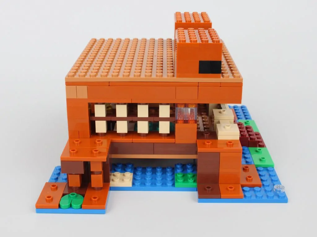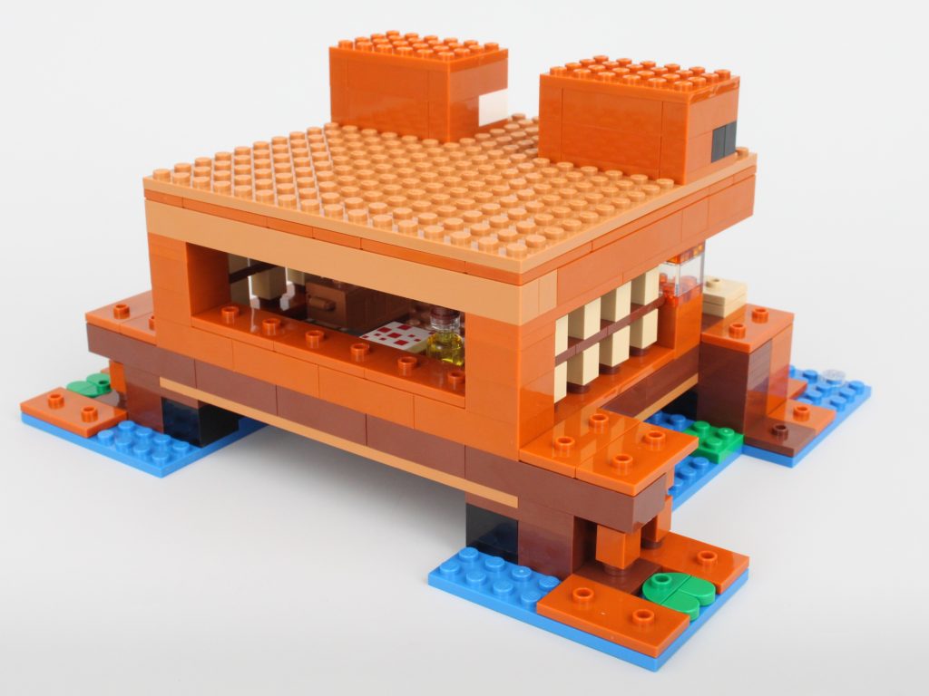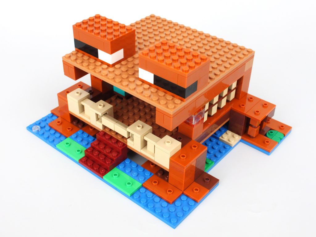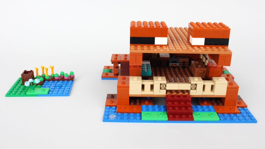 LEGO Minecraft-sæt har aldrig fået et kreativt navn, og det ændrer sig ikke 21256 Frøhuset, da langt størstedelen af de 400 styk i dette sæt går mod den brune bolig. Det mest bemærkelsesværdige træk er den gigantiske åbning på forsiden af huset, hvor der ikke er andet end et hegn og en låge, der forhindrer fjendtlige pøbler i at komme ind i eller skyde projektiler ind i hjemmet. Dette designvalg får huset til at føles eksplicit åbent og viser dets desværre hule karakter.