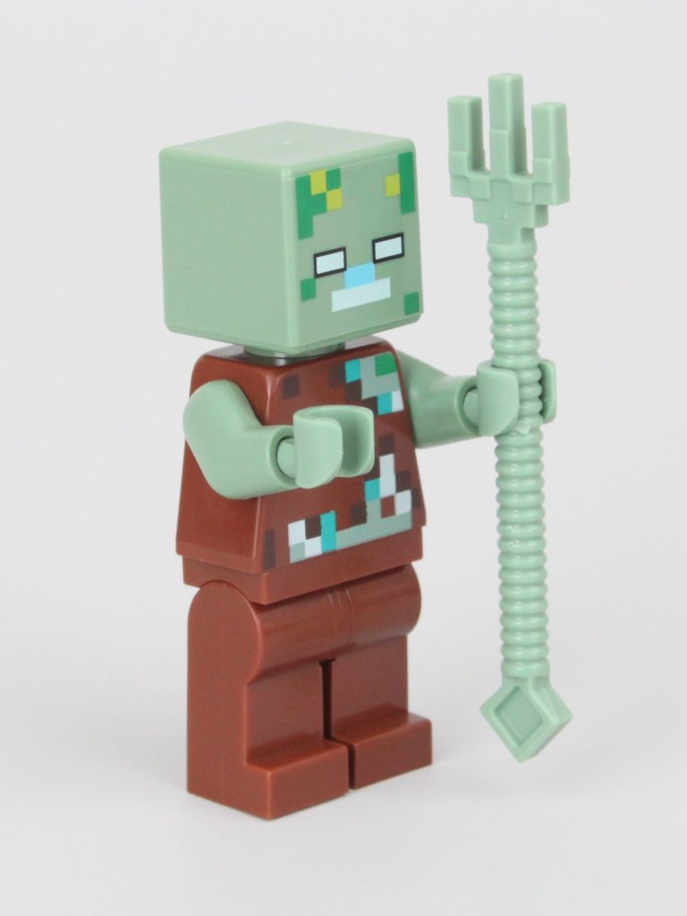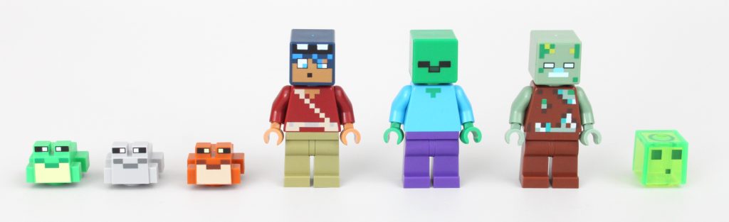 Der er tre minifigurer i 21256 Frøhuset, inklusive en eksklusiv spillerminifigur, en standard zombie og den mere ualmindelige Druknet med en trefork. Disse tre minifigurer er gode valg, og vi nyder den konsekvente strøm af spillerminifigurer med eksklusivt design i de forskellige LEGO Minecraft-sæt. Vi kan kun håbe, at denne tendens fortsætter, så længe temaet gør.