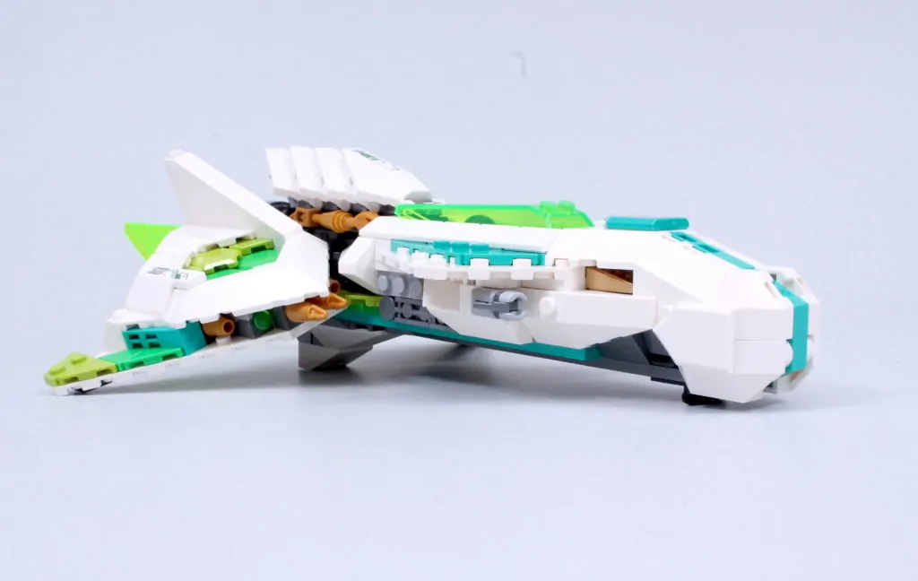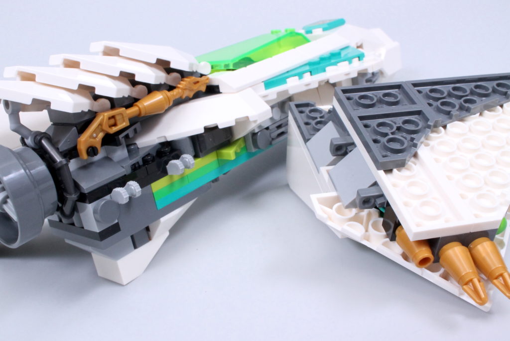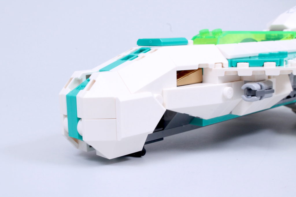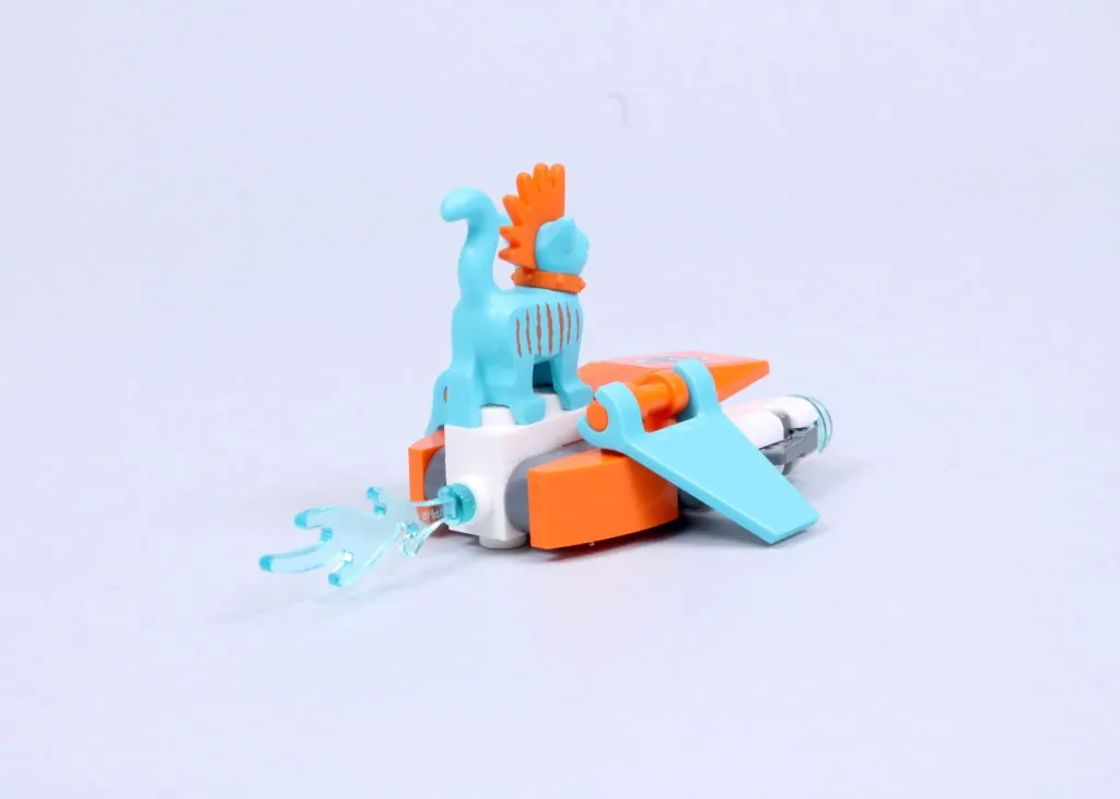 Vi siger næsten, for det er en fornøjelse at sammensætte Meis tur. Det er ikke kun gennem de involverede teknikker – selvom der er et par derinde, der kan tilføje en ny streng til din byggebue, inklusive næsen, der forankrer ryg-mod-ryg underenheder med en aksel og clips, og vingerne, der skjuler 2×2 hjørnefliser med 45-graders udskæringer som femkantede fliser – men på grund af de slående farver, du kan lege med, og den måde, de så glimrende kombinerer med den smarte, kantede karakter af skibsdelpaletten for at skabe en model, der er lige så bemærkelsesværdig at se på, som den er at samle.