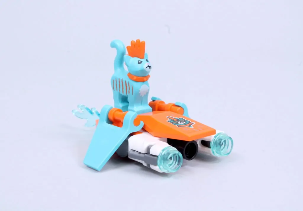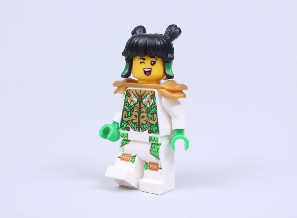 Mei mangler hjelmen, der kun findes i 80023 Monkie Kid's Team Dronecopter, men hendes hårstykke er uden tvivl mere interessant alligevel. Hun er ellers en af de bedste minifigurer, der er kommet ud af det hele Monkie Kid tema med to forskellige - men lige så tiltalende - ansigtsprint og et farveskema, der passer til hendes strålende jet.