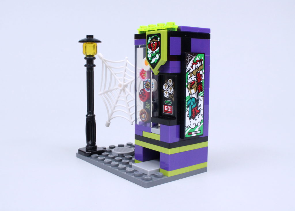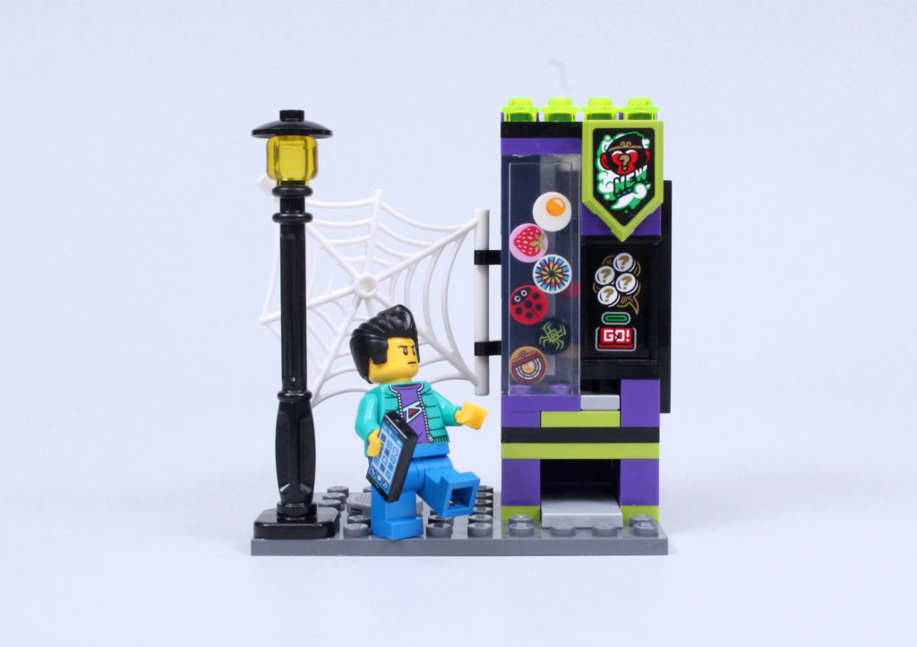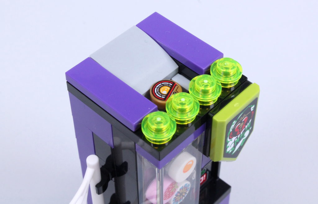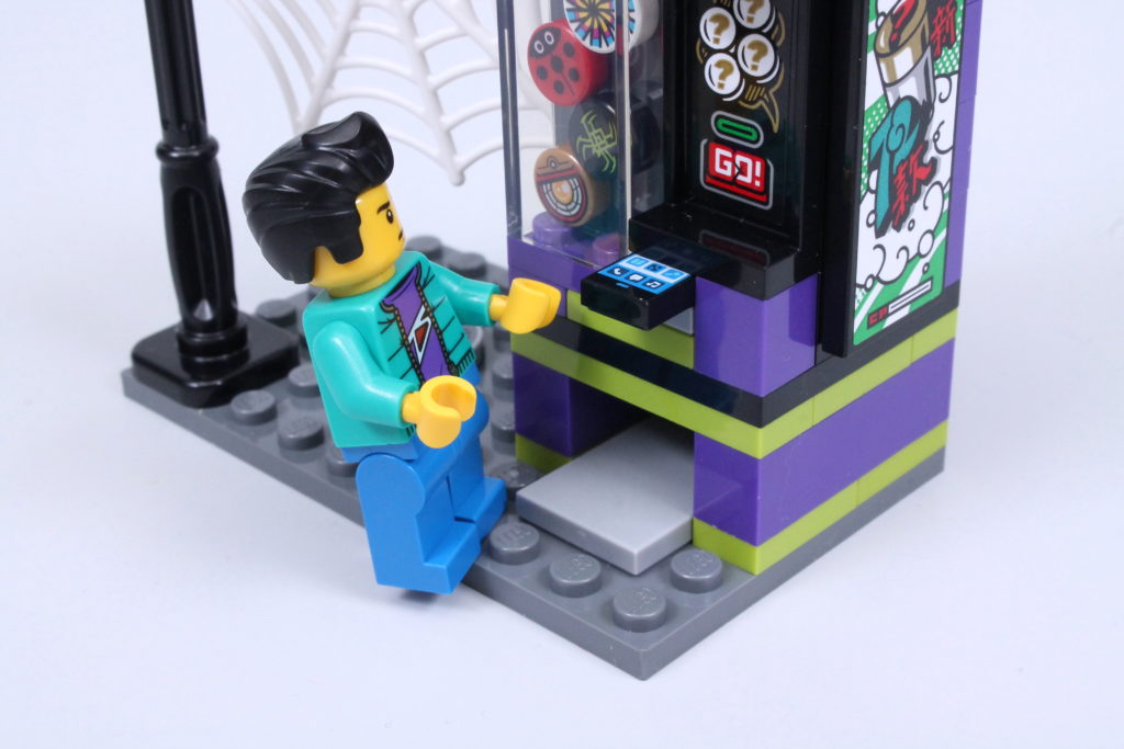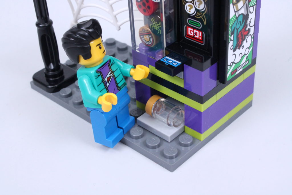 Den første af dem er automaten, der - som ved et trylleslag, men faktisk ved et meget intuitivt design - virkelig fungerer. Skub en 1×2 flise (i dette tilfælde Si's smartphone) ind i den passende åbning, og ud springer en 1×1 cylinder, toppet med en trykt 1×1 rund flise. Det er en metode, vi har set før i 70657 Ninjago City Docks, men der kan være få klager over genindførelse af en tilgang, der kun ses i et nu pensioneret £ 200-sæt.