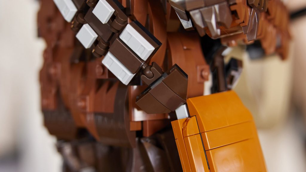 A nærbillede af den bygbare Wookiees taske tyder på, at kugleleddene, der blev brugt til hans bandolier – tidligere farvelåst til lys og mørkegrå – endelig vil være tilgængelige i en alternativ nuance den 1. september, når 75371 Chewbacca lanceres sammen med flere LEGO Star Wars sæt baseret på den kommende Ahsoka tv-serie. Men de er kun mørkebrune på det ene billede: i en 360-graders video af karakteren er de grå som sædvanligt.