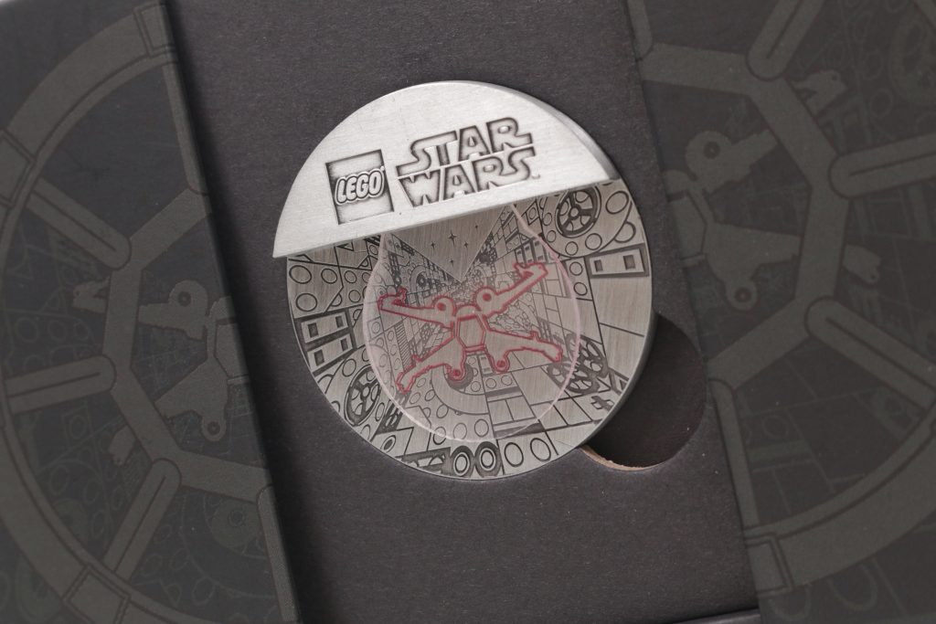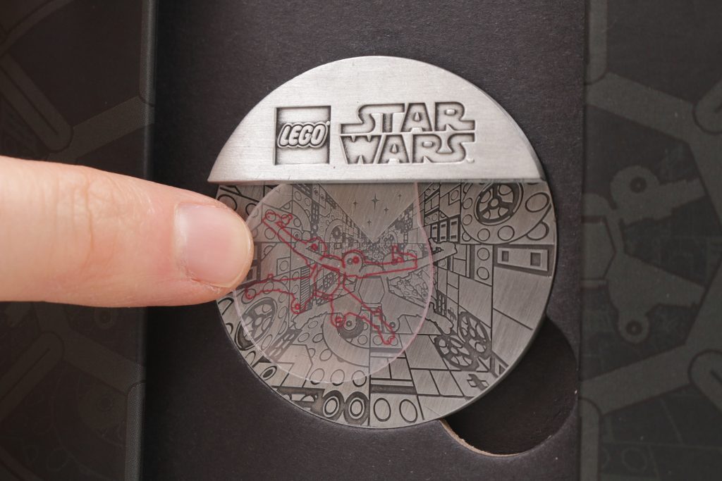 Det ligner en mønt, og det er sådan set en, bortset fra dette ekstra stykke metal på tværs af den øverste tredjedel, der har et bevægeligt klart stykke plastik på den. Det plastik har et rødt omrids af en X-Wing på sig, og det kan passe perfekt med X-Wing indgraveret i mønten nedenunder.