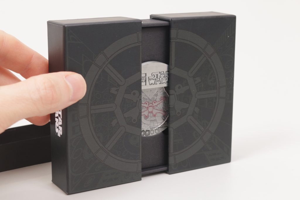 Effekten er uventet, men efterligner klogt udsigten fra en TIE Fighter, der jagter en X-Wing i Death Star-graven og holder den i sine mål. Fuld karakter for kreativitet og fuld karakter for præsentation, da den kommer i en meget fancy æske, der åbnes fra midten for at afsløre tokenet.
