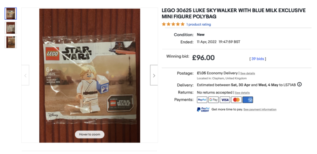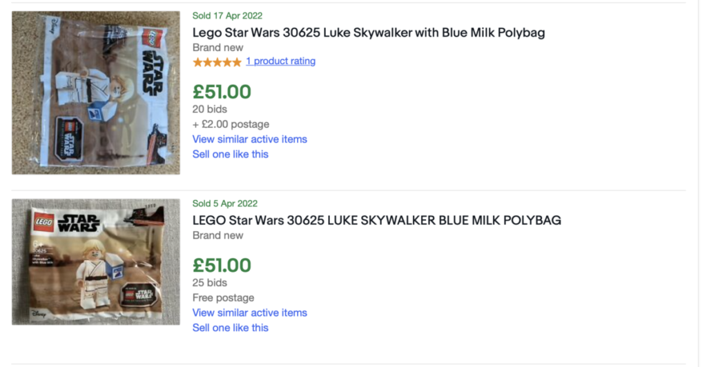 On eBayBlue Milk Luke – som omfatter to unikke elementer i Lukes dobbeltsidede hoved og den Bantha-dekorerede blå mælkekarton – har for eksempel solgt ved mere end én lejlighed for 51 £ i Storbritannien, hvor én auktion går så blæsende højt som £96. De fleste er udjævnet i £40-regionen, hvilket stadig er en fyrstelig sum for en enkelt minifigur.
