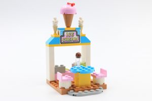 Dodge 'ems er hæfteklammer for de fleste karnevaler og de små LEGO gengivelser fungerer ret godt. De faktiske 'kofangere' er 1 × 4 buede fliser, og det at støde de to sammen er yderst tilfredsstillende. En minifigur ser lidt underligt ud at sidde oven på undvig dem i stedet for i den, men det er en mindre klage. Måske er den mindst succesrige mini-build isstanden. Det har et dejligt pastelfarveskema, der minder om Friends 41366 Olivias Cupcake Café (gennemgå), men det har ikke nok is (eller andre ækvivalenter, der ikke er mejeriprodukter) til at tilskynde til rollespil.