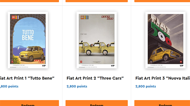 De attraktive 10271 Fiat 500 prints tager Classic reklamer for den italienske bil og inkorporer LEGO sættet i dem. Desværre for dem, der kan lide udseendet af dem, kræver de 2,800 point – mere end fire gange så mange point som nogle af LEGO Originals-printene og næsten £20 værd ifølge kuponerne – og fortsætter en tendens med at diskutere værdipropositionen på LEGO VIP-belønninger.