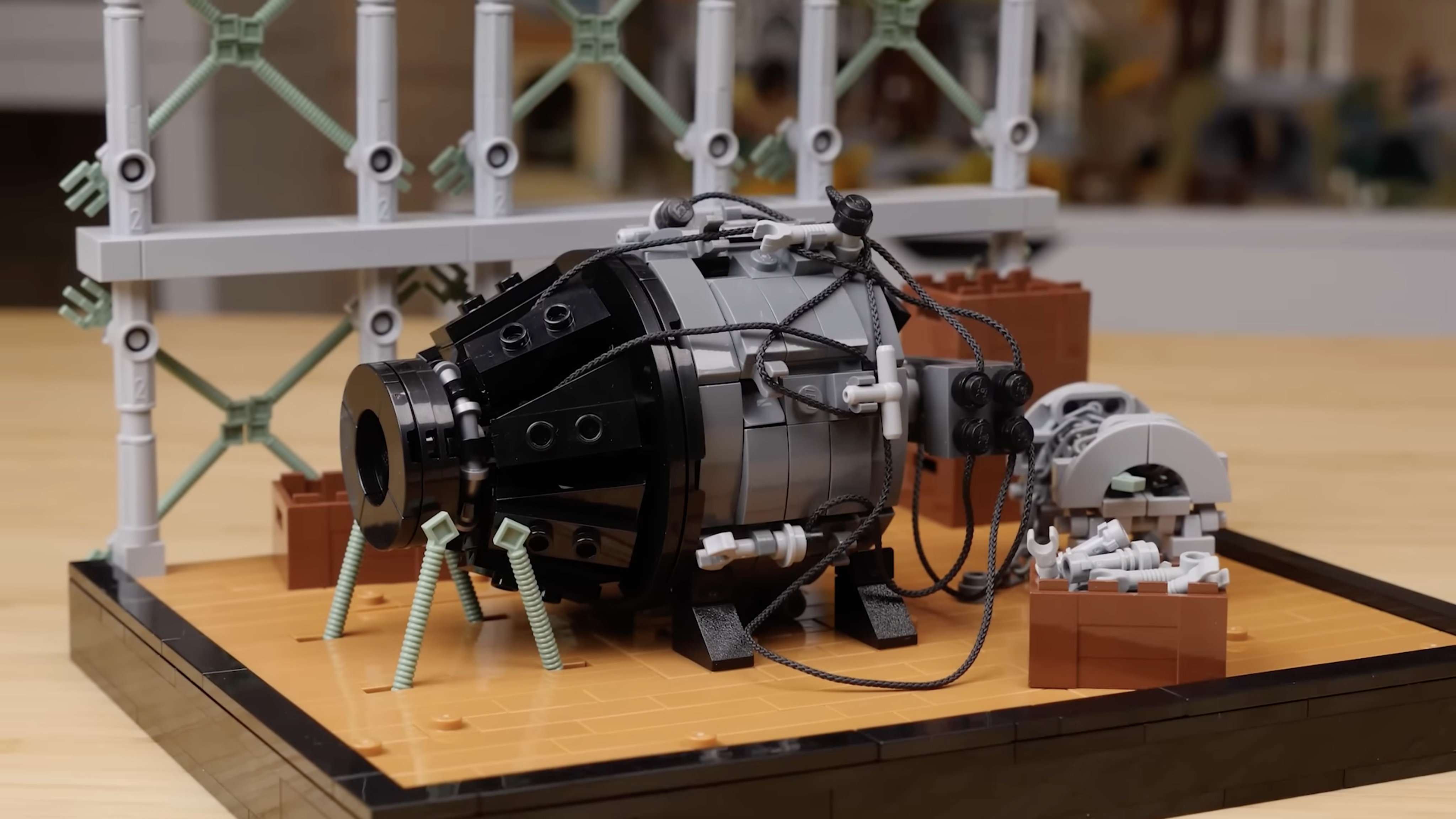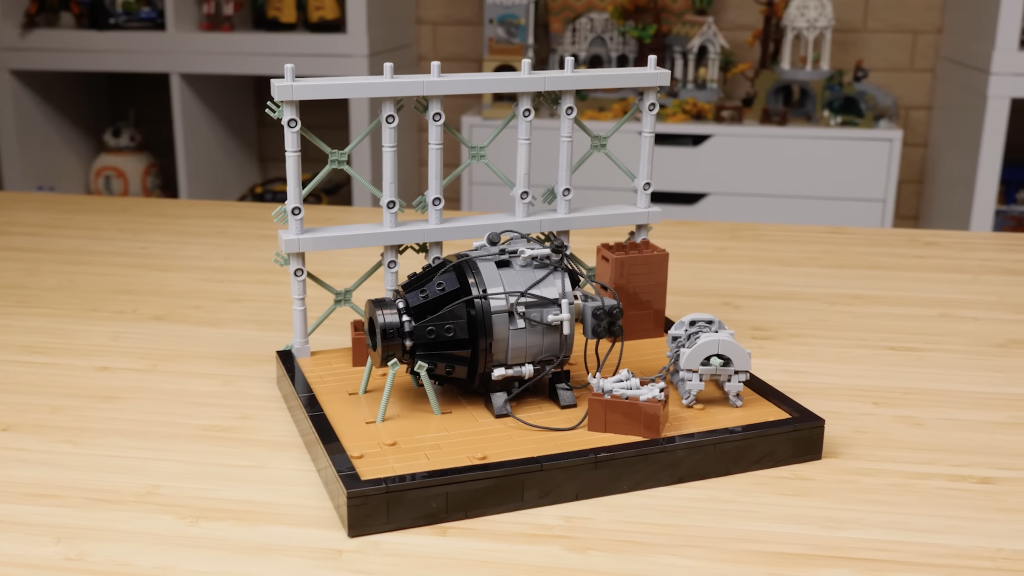 Som nævnt i vores egen anmeldelse, der er overraskende mange Technic styk i 43230 Walt Disney Tribute Camera, som – sammen med Minecraft tridenter – gjorde det muligt for bygherren at genskabe stilladset omkring Trinity-teststedets tårn. Kameraets afrundede elementer viste sig derefter at være perfekte til bombens koniske form.