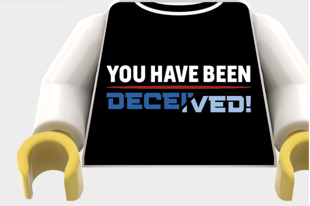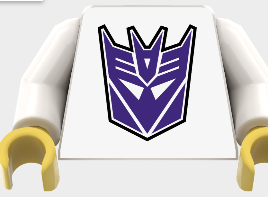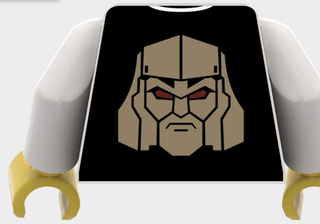 Den næste er en torso med Megatron-tema, trykt på en sort baggrund med citatet 'Du er blevet bedraget' på forsiden og Megatrons ansigt på bagsiden. Du kan også vælge farven på armene, hvis du ønsker en helt sort torso. Dette er måske det tætteste på LEGO Megatron, som vi sandsynligvis vil få, med Decepticon-lederen, der forvandles til våben, der ikke ville være på linje med LEGO Gruppens retningslinjer.