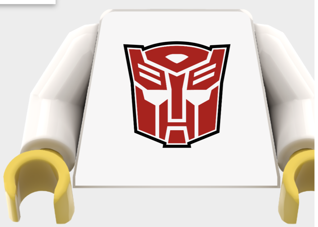 Tre andre designs – baseret på Transformers Animated AllSpark og Autobot og Decepticon-insignierne – kan placeres hvor som helst på en torso og skaleres. Vi har forstørret dem på torsoen for bedst at se dem, men du kan arrangere dem, som du vil, på din egen torso.