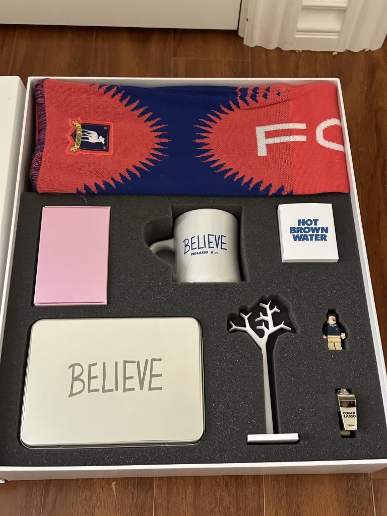 Dette inkluderer LEGO minifigur af Ted Lasso. Designet af printene kan se officielt ud, men der er intet, der bekræfter, at dette er en officiel minifigur produceret af LEGO Gruppe. Det kan simpelthen være en specialdesignet af en professionel uden for virksomheden, hyret af det team, der satte pakken sammen.