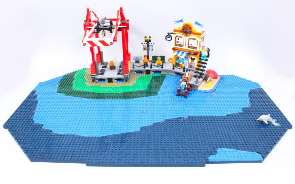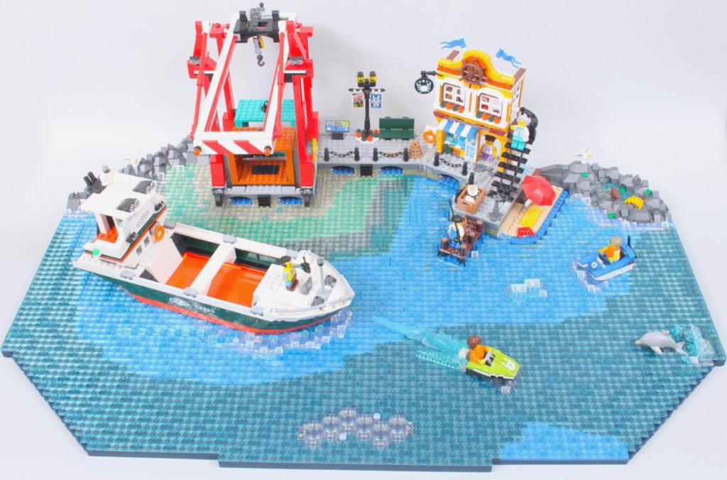 Til havnen blev der lavet lag til de fire bundplader i bunden af bygningen, de to lag og strukturelle mørkeblå plader, samt 60422 Havn ved havet med fragtskib omrids, det øverste lag af farvede plader for dybde og de gennemsigtige fliser til vandoverfladen.