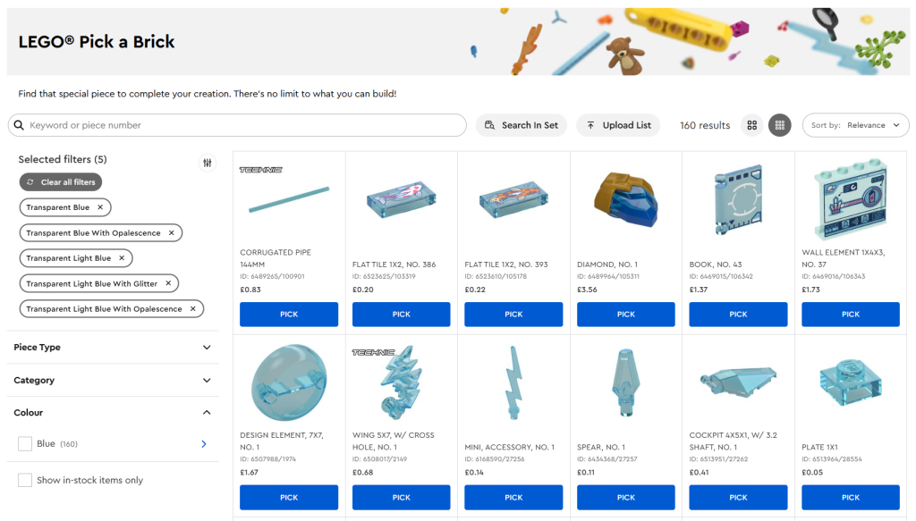 Når først du har idéen til din ønskede kreation i tankerne, er et godt sted for enhver at starte blot at gennemse den omfattende Vælg en mursten reservedelskatalog og vælg hvilke dele du vil inkludere mere end nogen andre. Til havneudstillingen kiggede vi først specifikt på gennemsigtige og gennemsigtige blå stykker og valgte nogle fra Ninjago, Architecture, Ideas og mere.