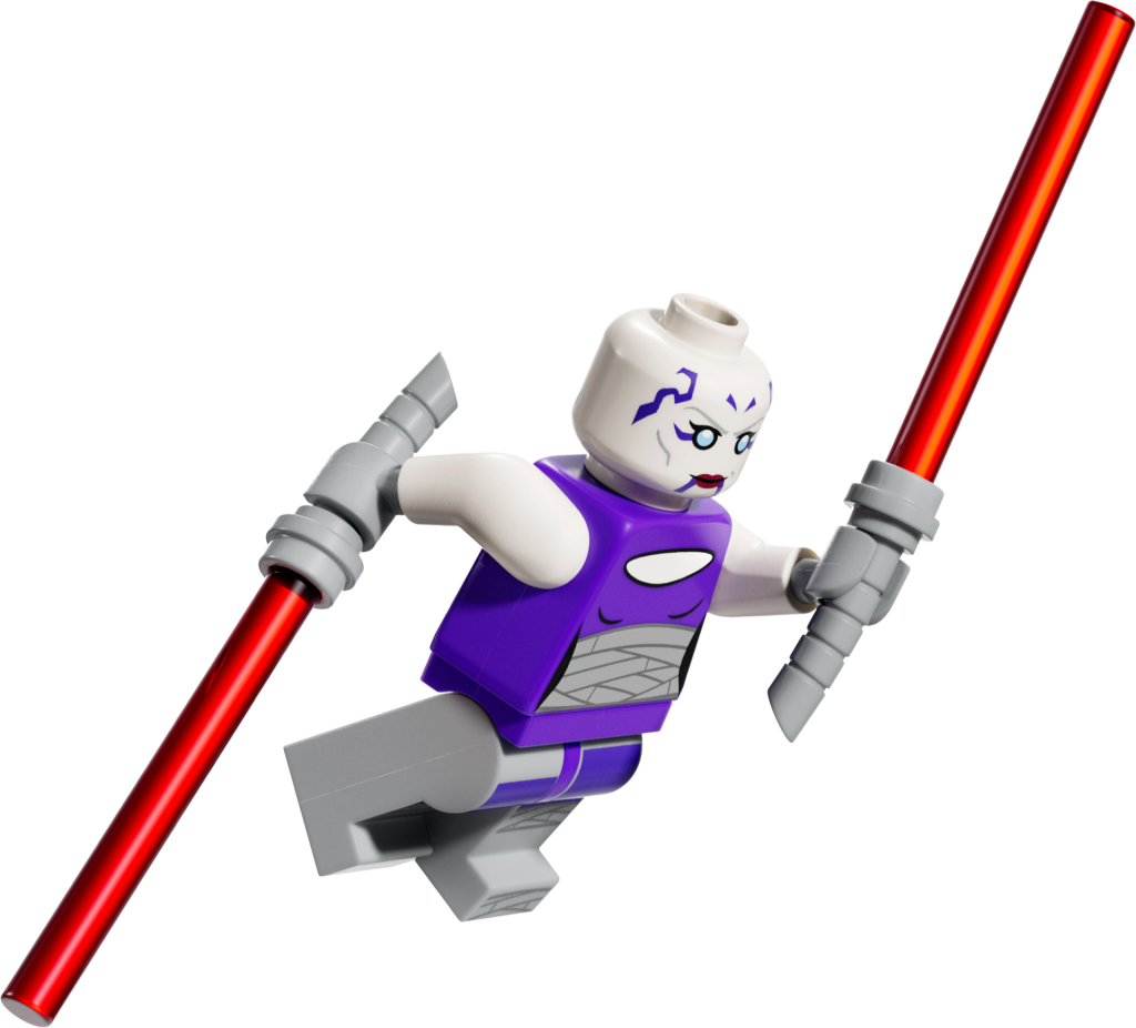 Asajj Ventress leveres komplet med specielt buede grebe på sine to røde lyssværd, klar til kamp mod Obi-Wan Kenobi i Clone Wars-rustning, bevæbnet med et blåt lyssværd, samt en tredje minifigur-klonpilot for at fuldende byggeoplevelsen på 567 dele.