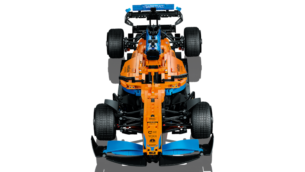Sponsorlogoerne er afbildet med klistermærker i 42141 McLaren Formel 1 racerbil, klar til at fans af racerløb kan værdsætte og beundre.